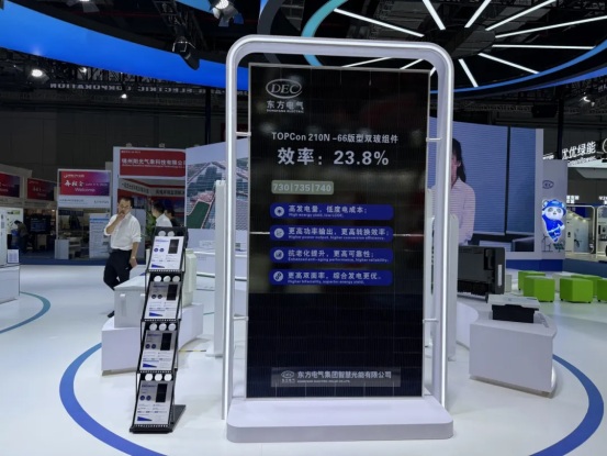 東方光能光伏組件系列產(chǎn)品,適用于分布式、地面電站、海上光伏等多應(yīng)用場景,本次參展的DEC自主品牌TOPCon 210N-66版型半片雙玻光伏組件,采用N型TOPCon電池技術(shù),發(fā)電功率最高達(dá)740瓦,轉(zhuǎn)換效率達(dá)到23.8%,電池技術(shù)和制造工藝位列行業(yè)前列,具有高發(fā)電量、低度電成本、高轉(zhuǎn)化效率、高可靠性、優(yōu)秀的抗衰減能力、綜合發(fā)電更優(yōu)等特點。